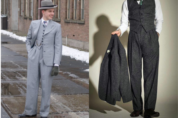 - Three-piece suits with wide lapels, high-waisted trousers, and matching vests.